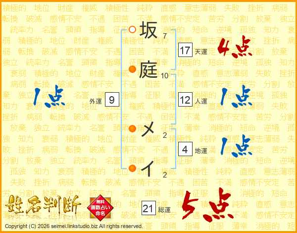 坂庭メイさんの総運は21画の5点!