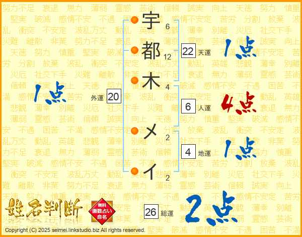 生活面を象徴する運勢です。外部から受ける影響力を表し、結婚運、家庭運や職場、環境への順応性を表します。総運から人運を引いた画数。姓や名が1文字の場合を除く。