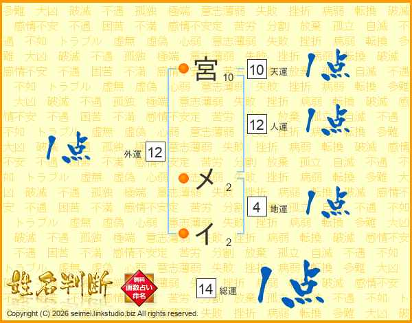 生活面を象徴する運勢です。外部から受ける影響力を表し、結婚運、家庭運や職場、環境への順応性を表します。総運から人運を引いた画数。姓や名が1文字の場合を除く。