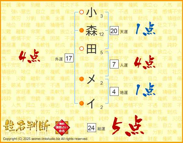 生活面を象徴する運勢です。外部から受ける影響力を表し、結婚運、家庭運や職場、環境への順応性を表します。総運から人運を引いた画数。姓や名が1文字の場合を除く。