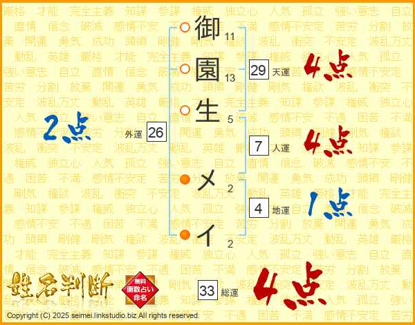 御(11画)園(13画)生(5画) メ(2画)イ(2画)