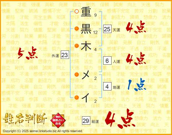 重(9画)黒(12画)木(4画) メ(2画)イ(2画)