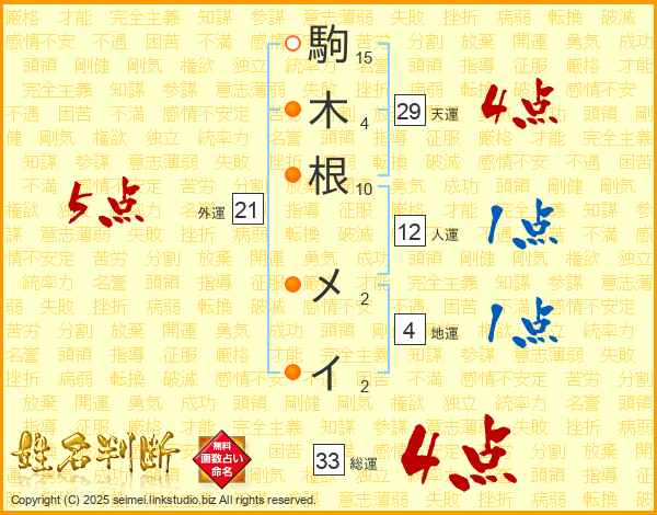 駒(15画)木(4画)根(10画) メ(2画)イ(2画)
