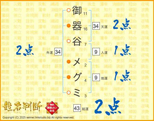 御(11画)器(16画)谷(7画) メ(2画)グ(4画)ミ(3画)