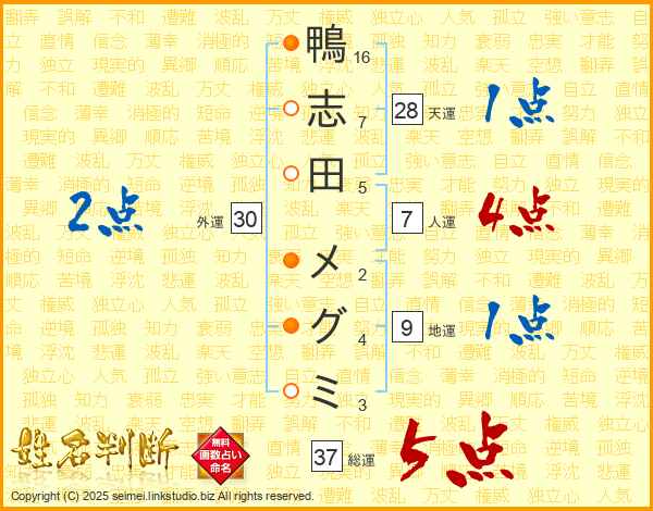 鴨(16画)志(7画)田(5画) メ(2画)グ(4画)ミ(3画)