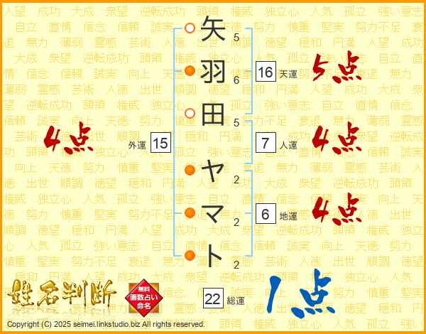 矢(5画)羽(6画)田(5画) ヤ(2画)マ(2画)ト(2画)