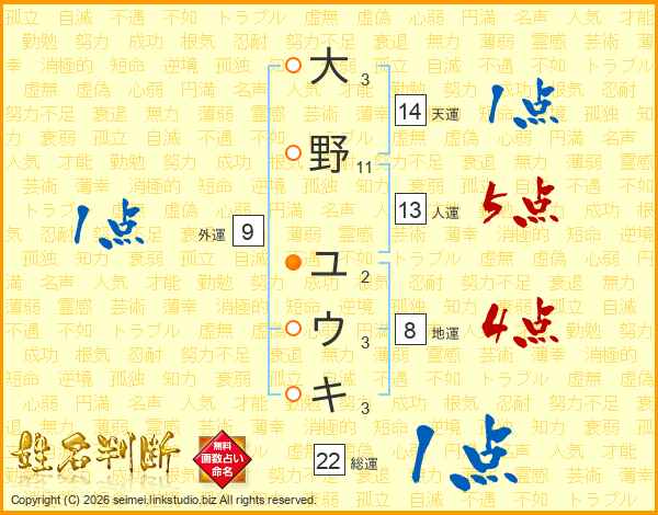 大野ユウキさんの人運は13画の5点!