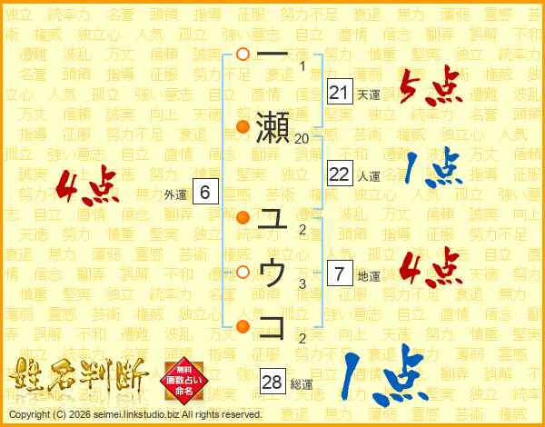 一(1画)瀬(20画) ユ(2画)ウ(3画)コ(2画)