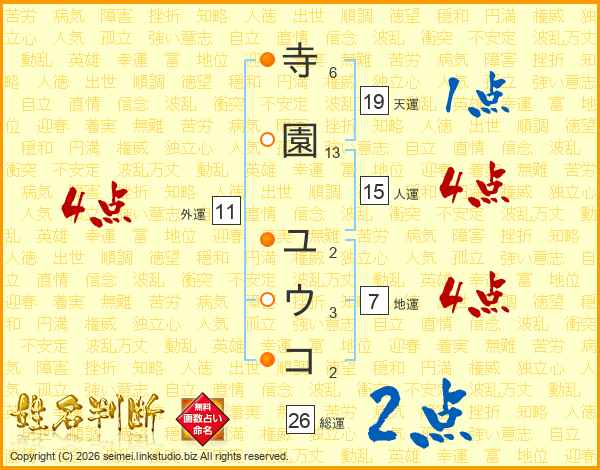 寺園ユウコさんの総運は26画の2点!
