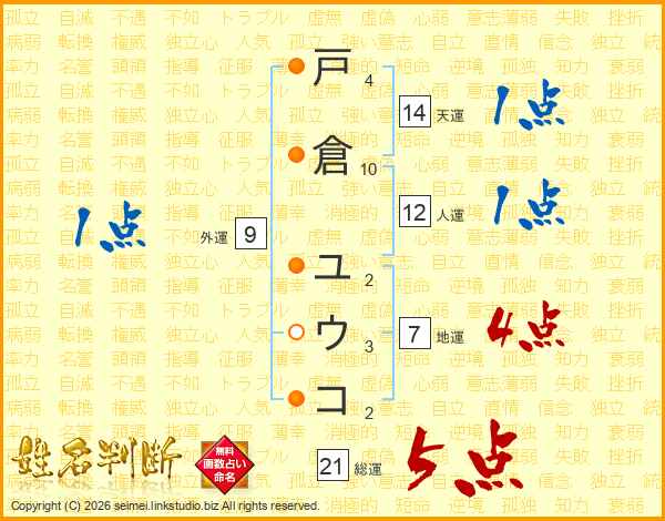 生活面を象徴する運勢です。外部から受ける影響力を表し、結婚運、家庭運や職場、環境への順応性を表します。総運から人運を引いた画数。姓や名が1文字の場合を除く。