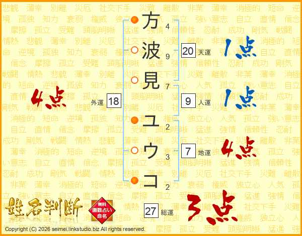 画数の奇数(○陽)と偶数(●陰)の配列で吉凶を占います。どちらかにかたよる名前は大凶名で避ける必要があります。画数の奇数偶数。
