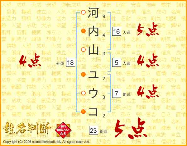 生活面を象徴する運勢です。外部から受ける影響力を表し、結婚運、家庭運や職場、環境への順応性を表します。総運から人運を引いた画数。姓や名が1文字の場合を除く。