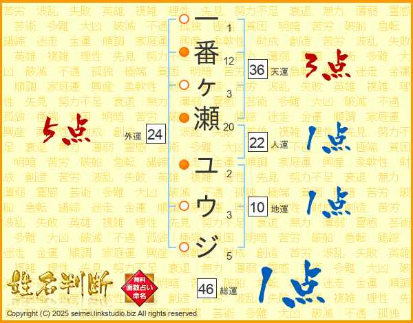 一番ヶ瀬ユウジさんの総運は46画の1点!