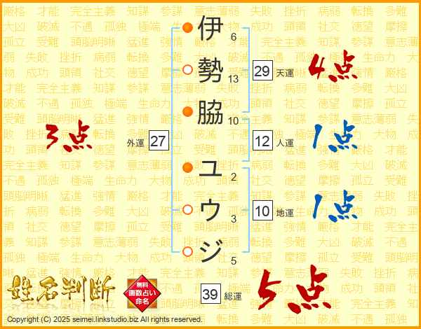 伊(6画)勢(13画)脇(10画) ユ(2画)ウ(3画)ジ(5画)