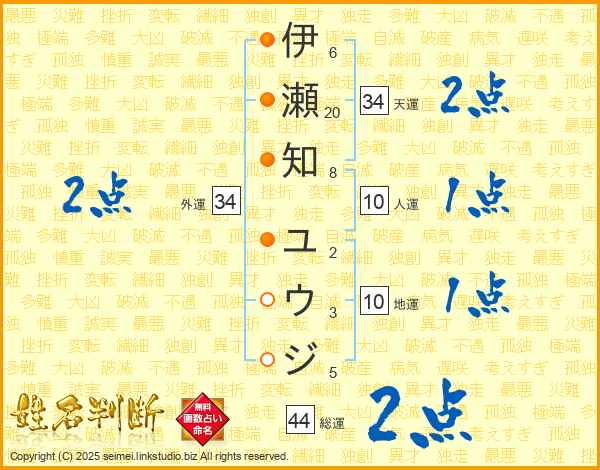 伊(6画)瀬(20画)知(8画) ユ(2画)ウ(3画)ジ(5画)