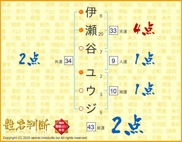 伊(6画)瀬(20画)谷(7画) ユ(2画)ウ(3画)ジ(5画)