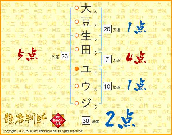 生活面を象徴する運勢です。外部から受ける影響力を表し、結婚運、家庭運や職場、環境への順応性を表します。総運から人運を引いた画数。姓や名が1文字の場合を除く。