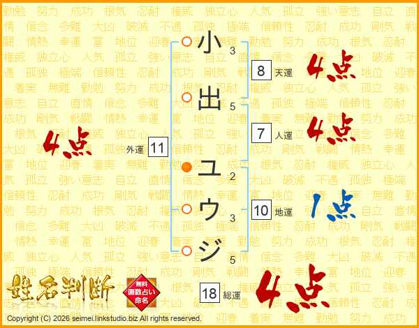 生活面を象徴する運勢です。外部から受ける影響力を表し、結婚運、家庭運や職場、環境への順応性を表します。総運から人運を引いた画数。姓や名が1文字の場合を除く。