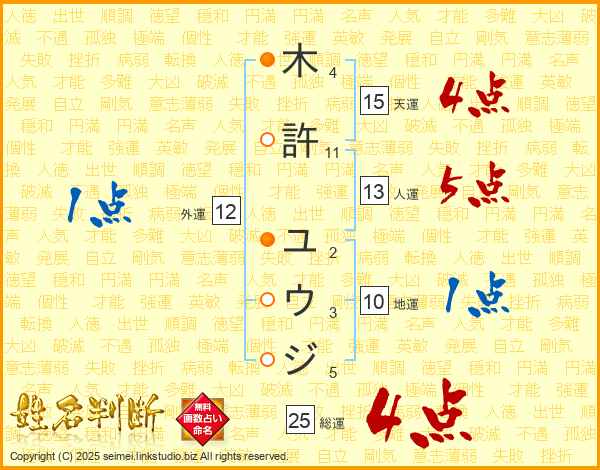 木(4画)許(11画) ユ(2画)ウ(3画)ジ(5画)
