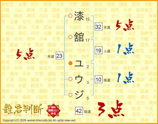 生活面を象徴する運勢です。外部から受ける影響力を表し、結婚運、家庭運や職場、環境への順応性を表します。総運から人運を引いた画数。姓や名が1文字の場合を除く。