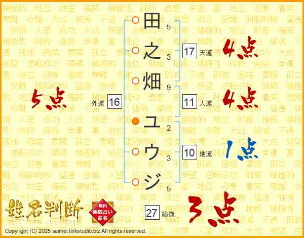 田(5画)之(3画)畑(9画) ユ(2画)ウ(3画)ジ(5画)