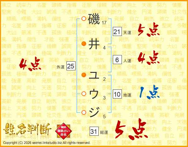 磯(17画)井(4画) ユ(2画)ウ(3画)ジ(5画)