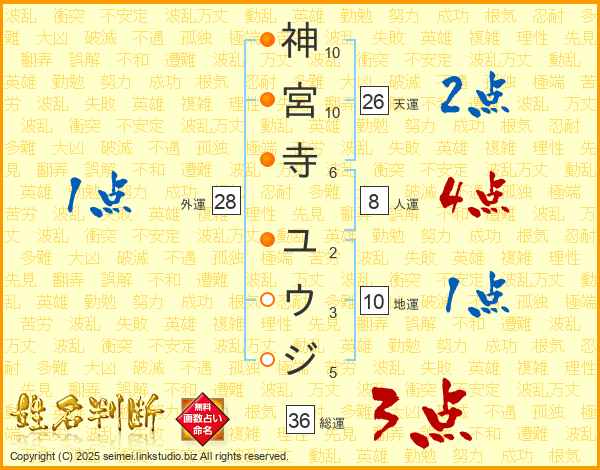 神(10画)宮(10画)寺(6画) ユ(2画)ウ(3画)ジ(5画)