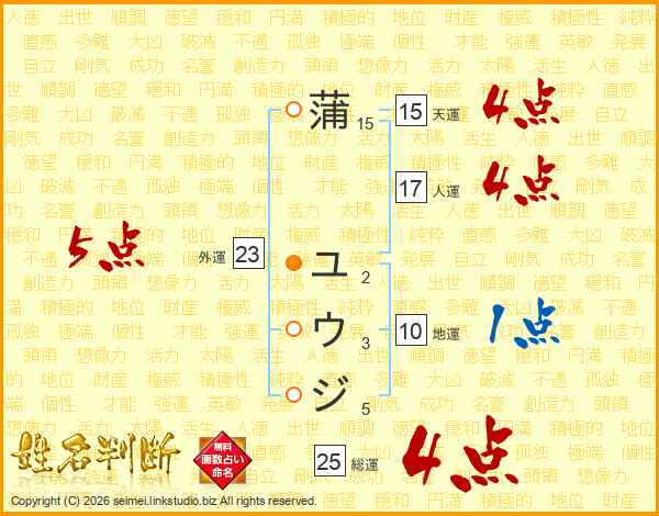 蒲(15画) ユ(2画)ウ(3画)ジ(5画)