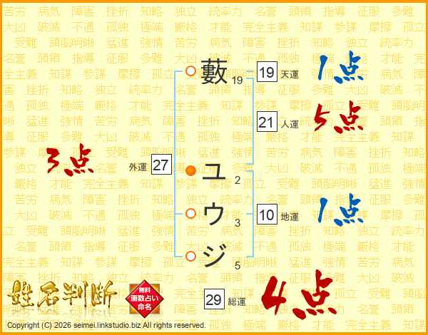 藪ユウジさんの総運は29画の4点!