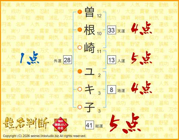 曽(12画)根(10画)崎(11画) ユ(2画)キ(3画)子(3画)