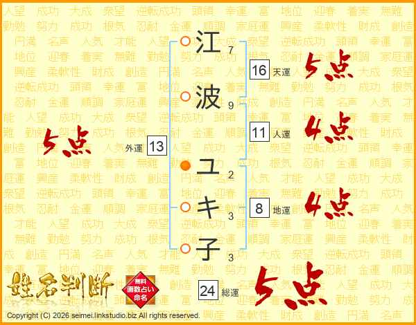 江(7画)波(9画) ユ(2画)キ(3画)子(3画)