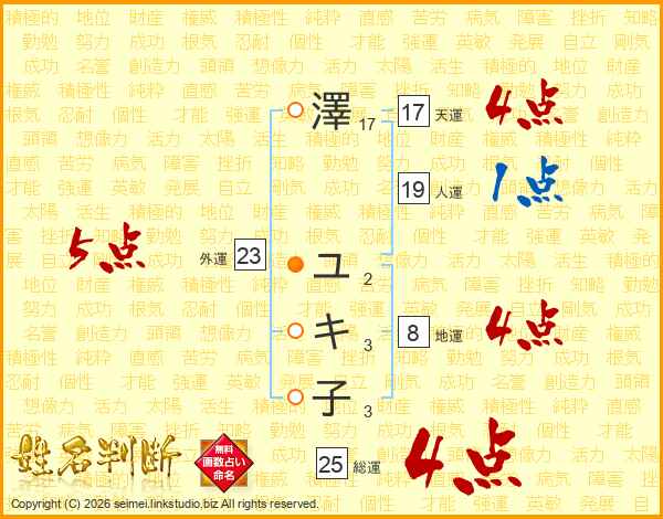 澤(17画) ユ(2画)キ(3画)子(3画)