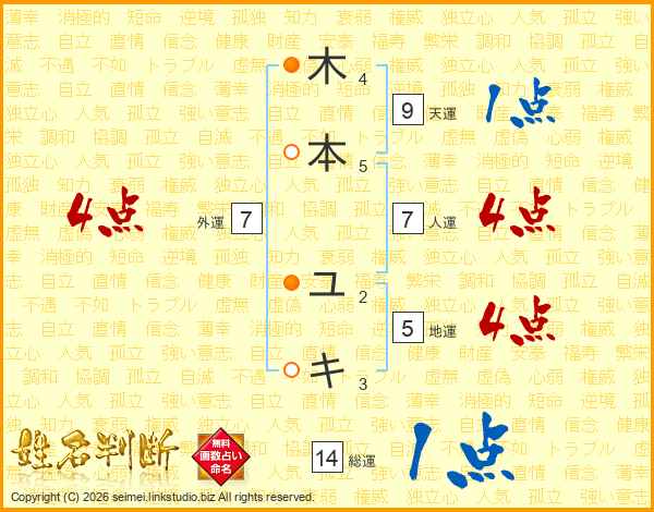 生活面を象徴する運勢です。外部から受ける影響力を表し、結婚運、家庭運や職場、環境への順応性を表します。総運から人運を引いた画数。姓や名が1文字の場合を除く。