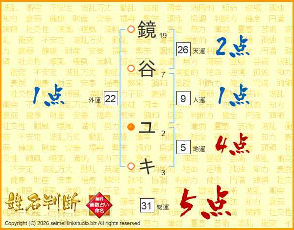 鏡谷ユキさんの天運は26画の2点!