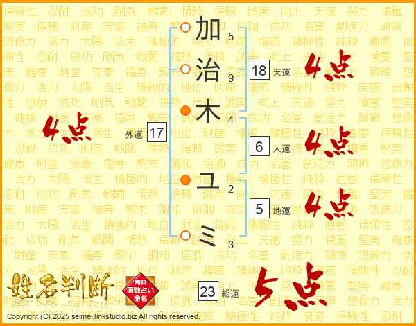 加(5画)治(9画)木(4画) ユ(2画)ミ(3画)
