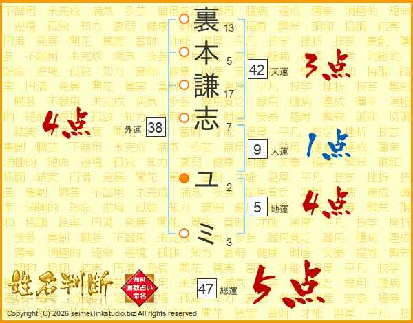 裏本謙志ユミさんの総運は47画の5点!