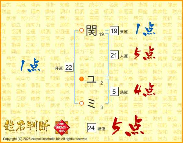 生活面を象徴する運勢です。外部から受ける影響力を表し、結婚運、家庭運や職場、環境への順応性を表します。総運から人運を引いた画数。姓や名が1文字の場合を除く。