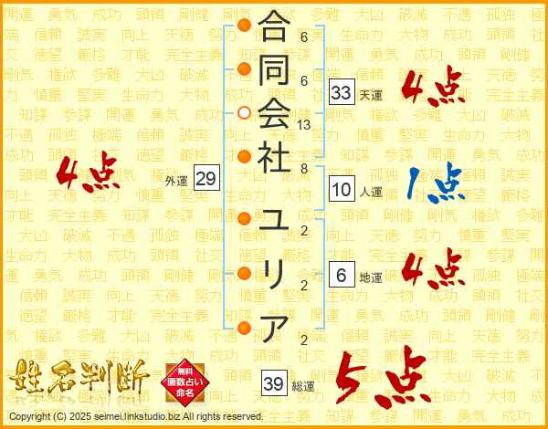 生活面を象徴する運勢です。外部から受ける影響力を表し、結婚運、家庭運や職場、環境への順応性を表します。総運から人運を引いた画数。姓や名が1文字の場合を除く。