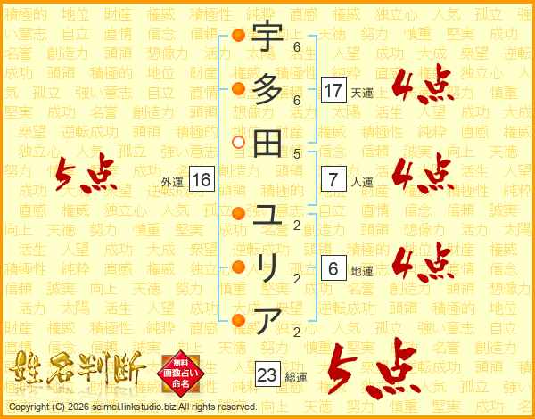 宇(6画)多(6画)田(5画) ユ(2画)リ(2画)ア(2画)