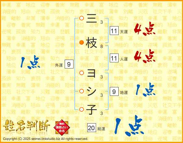三(3画)枝(8画) ヨ(3画)シ(3画)子(3画)