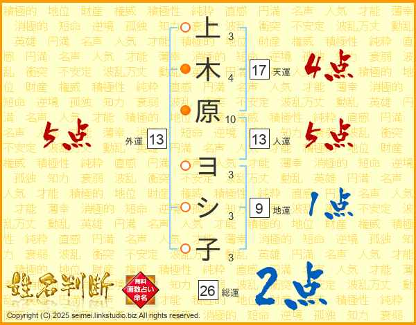 上(3画)木(4画)原(10画) ヨ(3画)シ(3画)子(3画)
