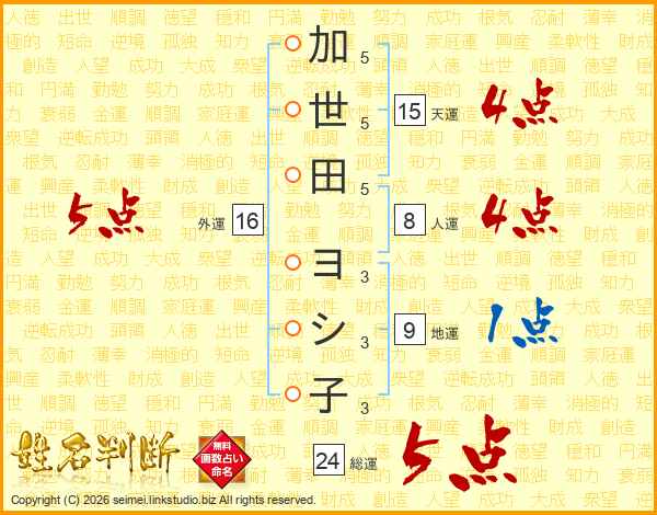 加(5画)世(5画)田(5画) ヨ(3画)シ(3画)子(3画)