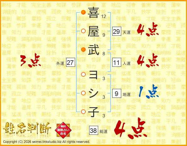 喜(12画)屋(9画)武(8画) ヨ(3画)シ(3画)子(3画)