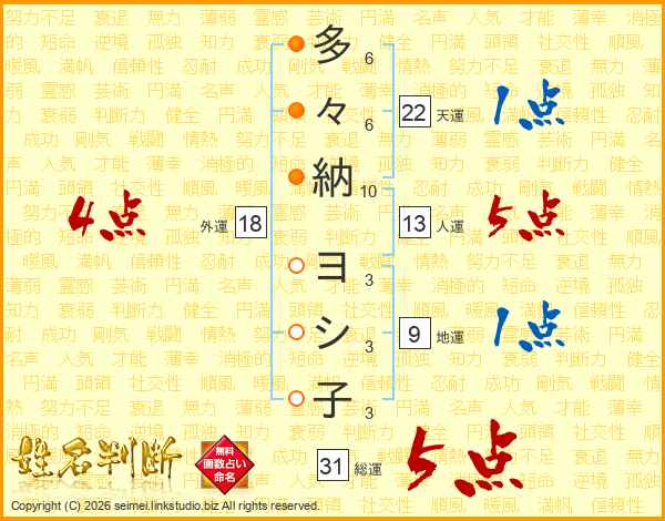 多々納ヨシ子さんの総運は31画の5点!