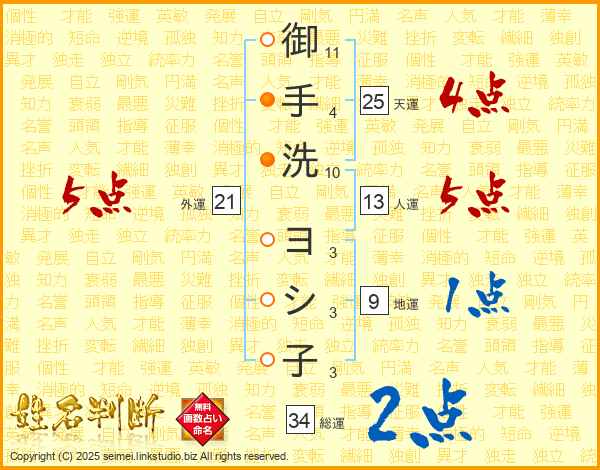 御(11画)手(4画)洗(10画) ヨ(3画)シ(3画)子(3画)