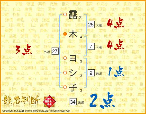露(21画)木(4画) ヨ(3画)シ(3画)子(3画)