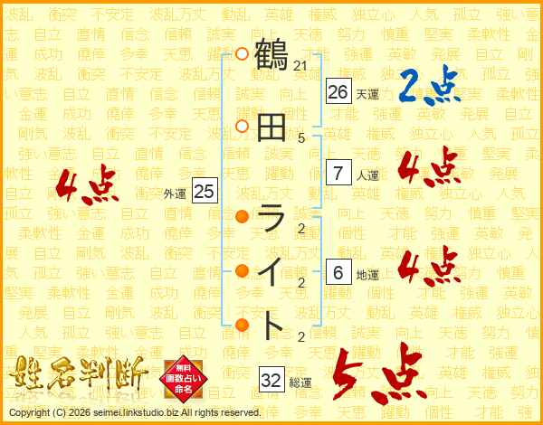 鶴田ライトさんの総運は32画の5点!