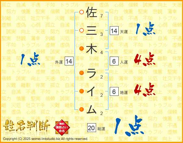 佐(7画)三(3画)木(4画) ラ(2画)イ(2画)ム(2画)