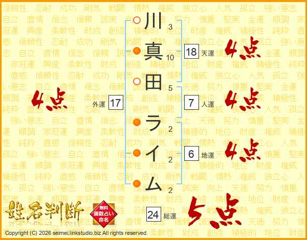 川(3画)真(10画)田(5画) ラ(2画)イ(2画)ム(2画)