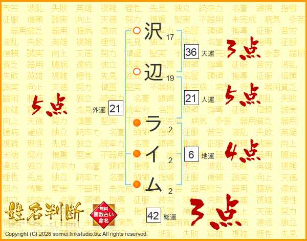 沢(17画)辺(19画) ラ(2画)イ(2画)ム(2画)